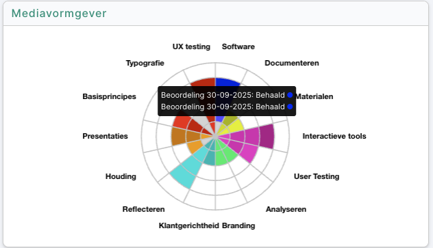 Met het element Opleidingsdiagram kan de studievoortgang van de student zichtbaar gemaakt worden op een portfolio pagina. In het diagram kun je eerdere beoordelingen terugzien en heb je doorklikmogelijkheden naar de beoordelingen. Na het kiezen van het element kun je: