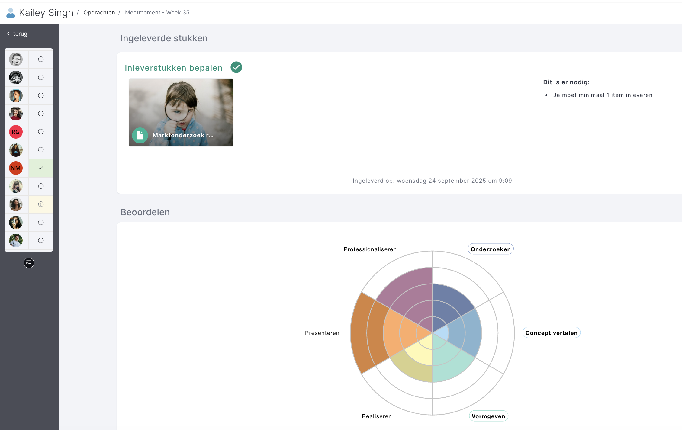 - Je ziet nu de beoordelen pagina per deelaspect. De opdrachten gekoppeld aan het deelaspect worden weergegeven.