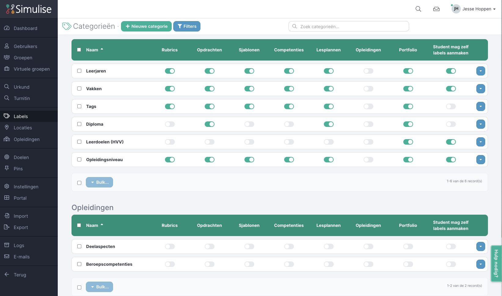 Alle gemaakte deelaspecten en beroepscompetenties worden weergegeven in de labels module. De categorieën zijn alleen zichtbaar als de module Opleidingen actief is in jullie omgeving.
