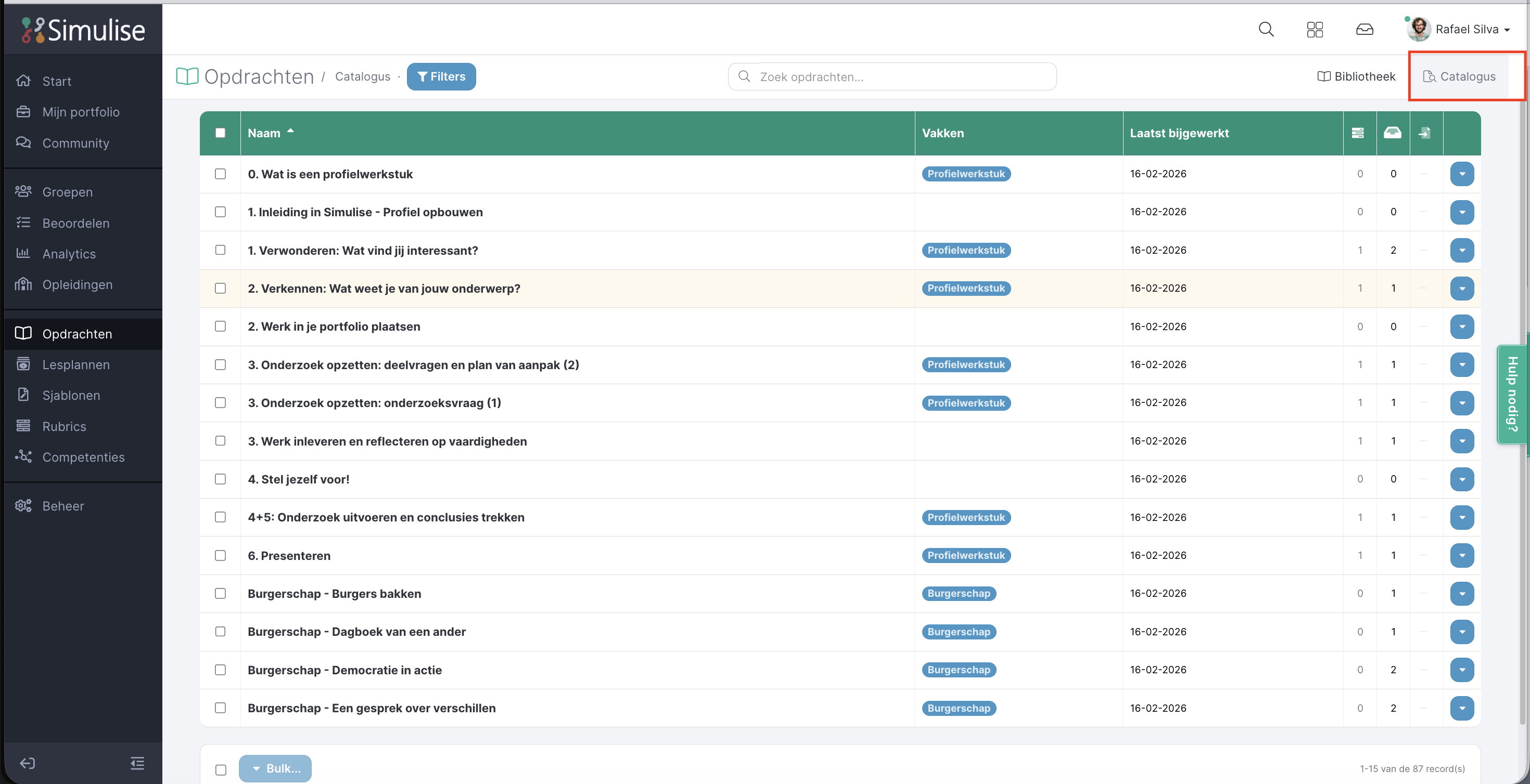De catalogus biedt de mogelijkheid om voorbeeld opdrachten, sjablonen, rubrics te importeren naar je eigen omgeving. De voorbeeld items zijn klaargezet door Simulise.